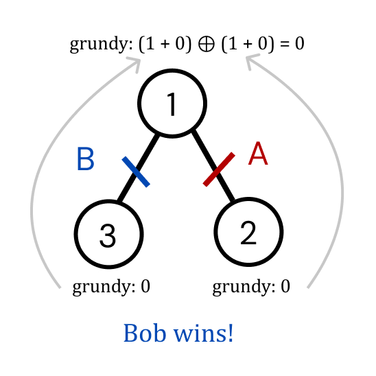 For the subtrees rooted at and , the grundy values will be . For the tree rooted at , the grundy value will be . This makes sense because whichever edge that Alice chooses, Bob can choose the other one leaving Alice with no edge to delete and she will lose.