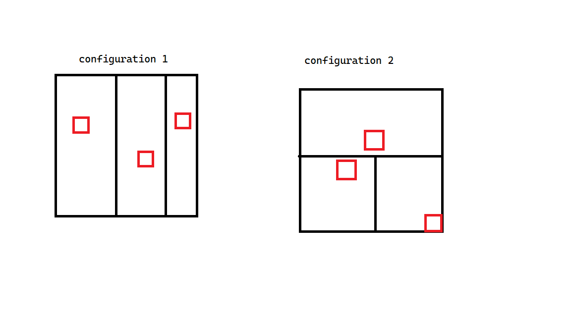 In this configuration, we can find the answer for each non-middle subrectangle using the method in Configuration 2. However, we need to use another recurrence to find the middle rectangle. WLOG let the subrectangles be arranged in top-down order, as the left-right order can be found similarly. Let be the answer for the rows in interval . Obviously has no answers if . We can also manually find manually as a base case. Next, note that consists of all squares counted in and . Then, there are just the squares counted in row and row , which is just and respectively. Thus, the recurrence is Note that intervals must be traversed from smallest to largest.