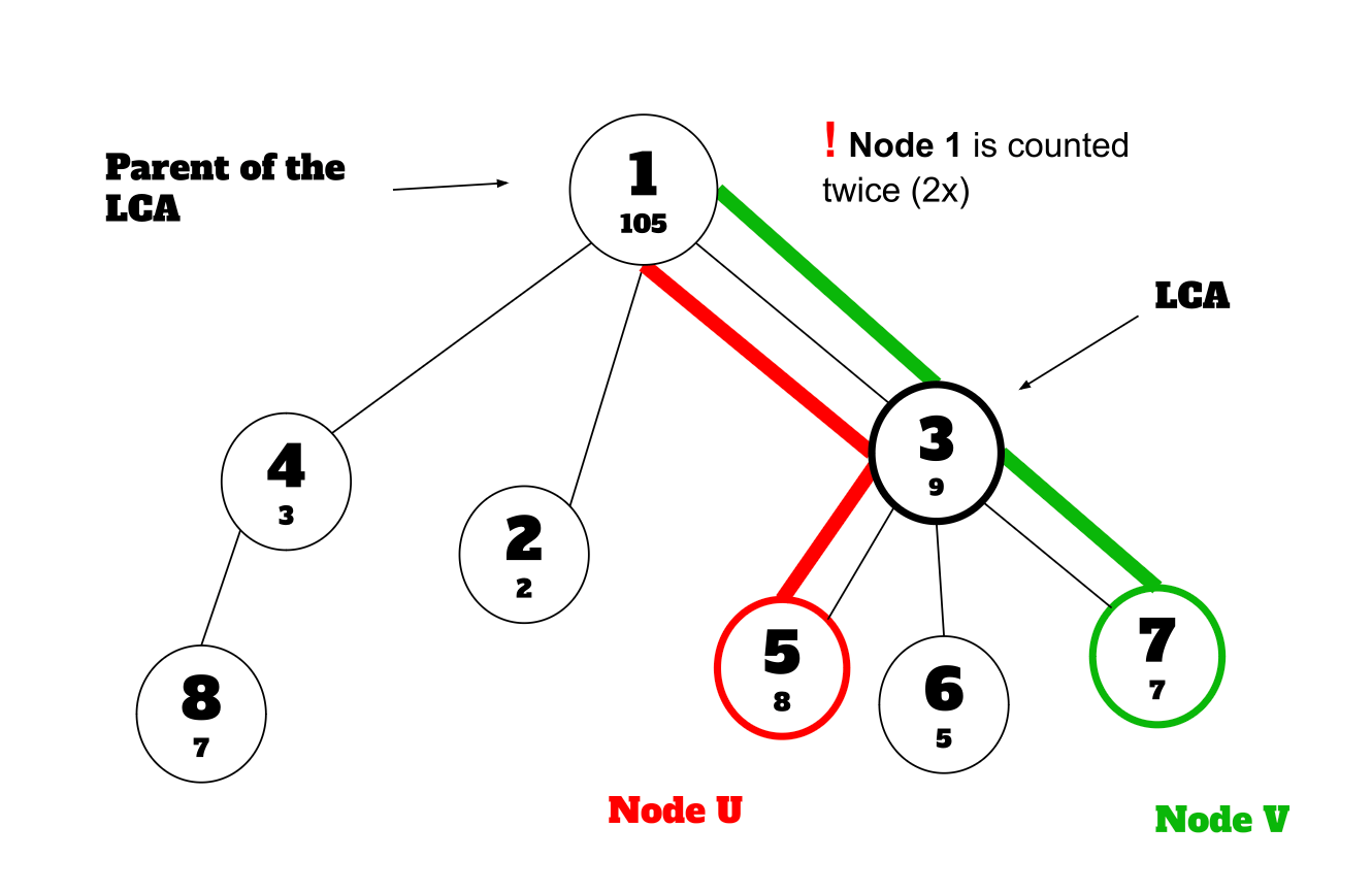 Since the values that are not on the path of and , but on the path from the root node to the nodes and are also counted in their persistent segment trees, just considering their persistent segment trees would produce the wrong results.