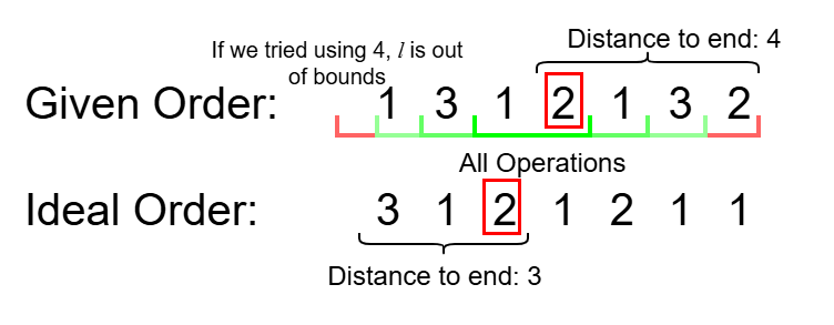 Thus, the amount of contributions that can be made from a cow at location and desirable location at location is limited by the minimum distance to either end of the order, as after that or would violate the given constraints for a valid operation.